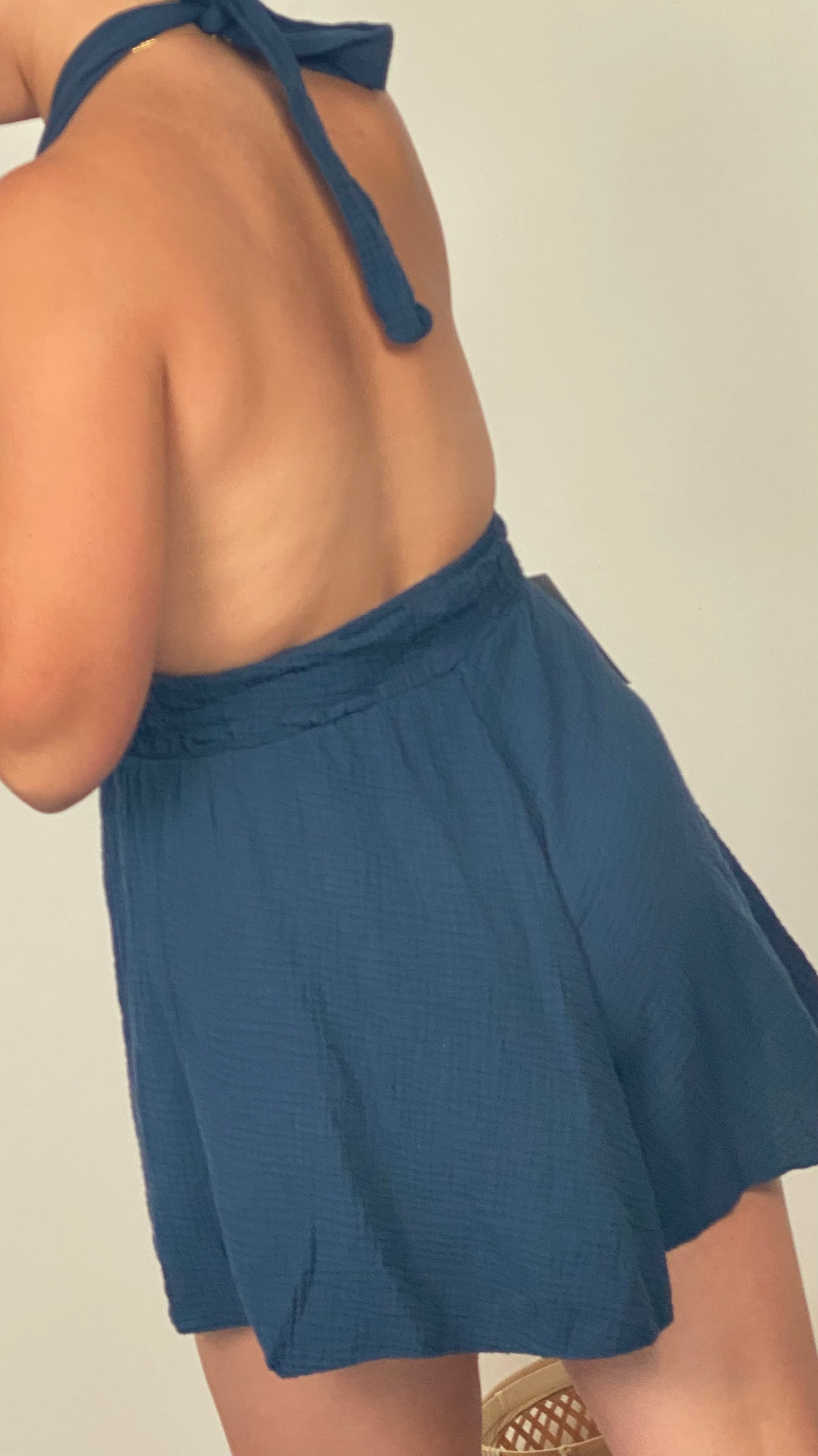 ♥ Combinaison short en gaz de coton dos nu bleu marine