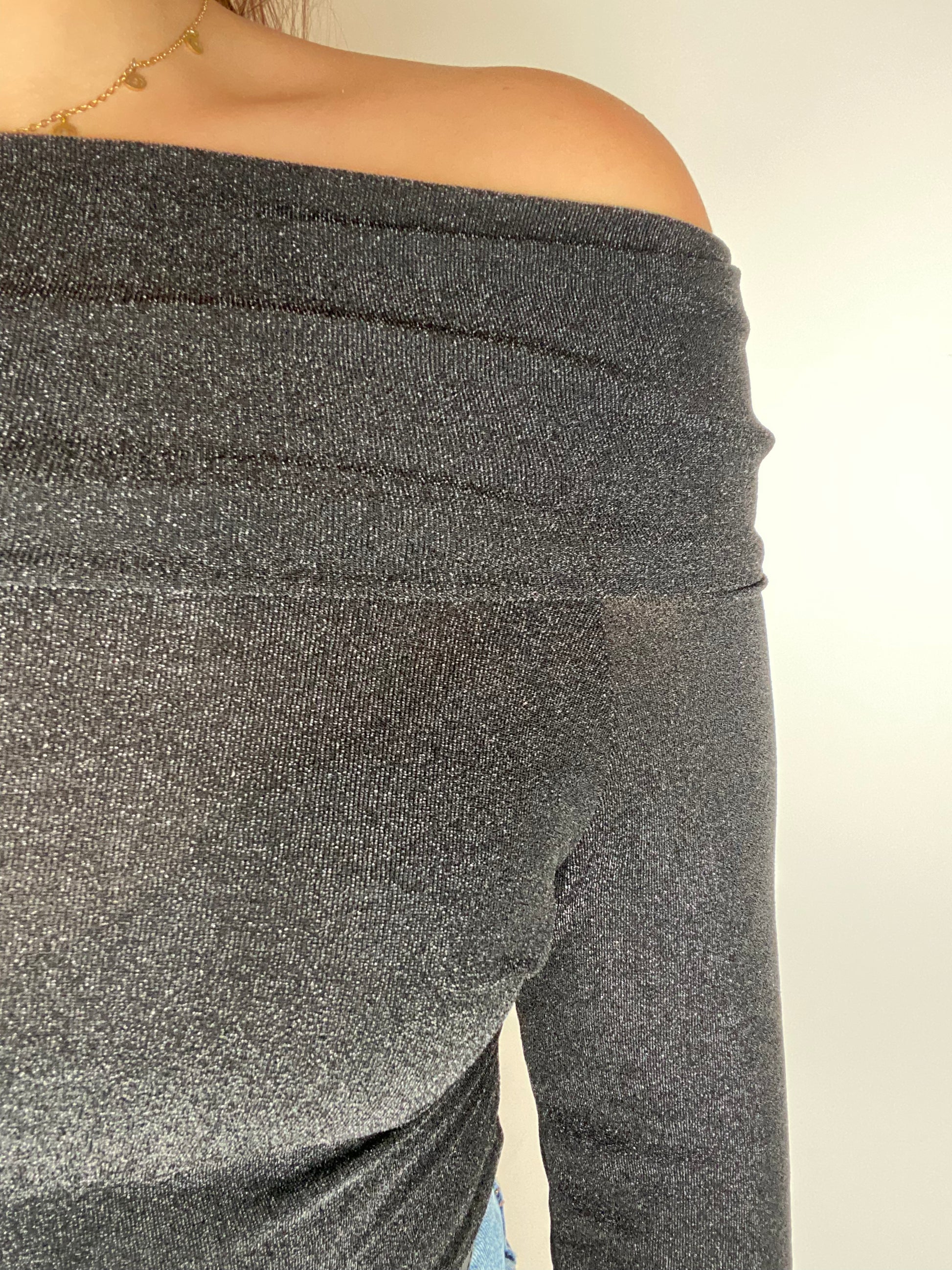 ♥ Top moulant noir à paillettes col bardot (épaules dénudées)